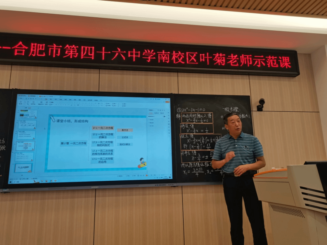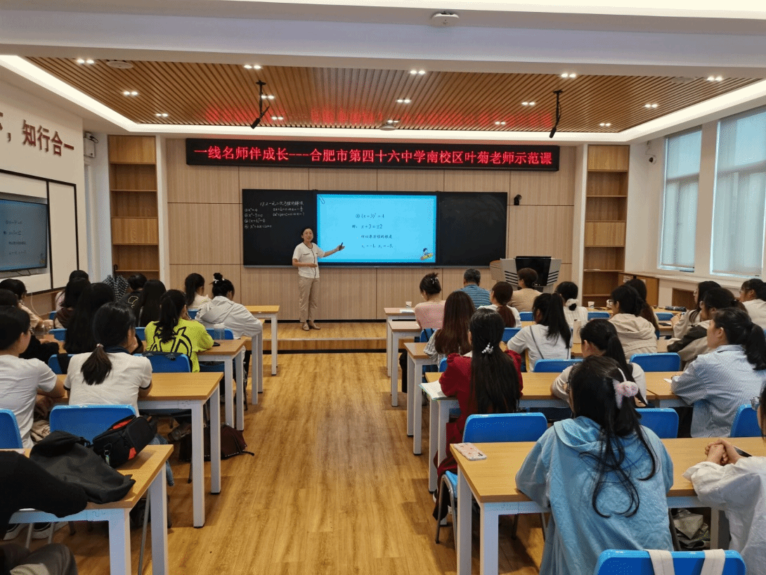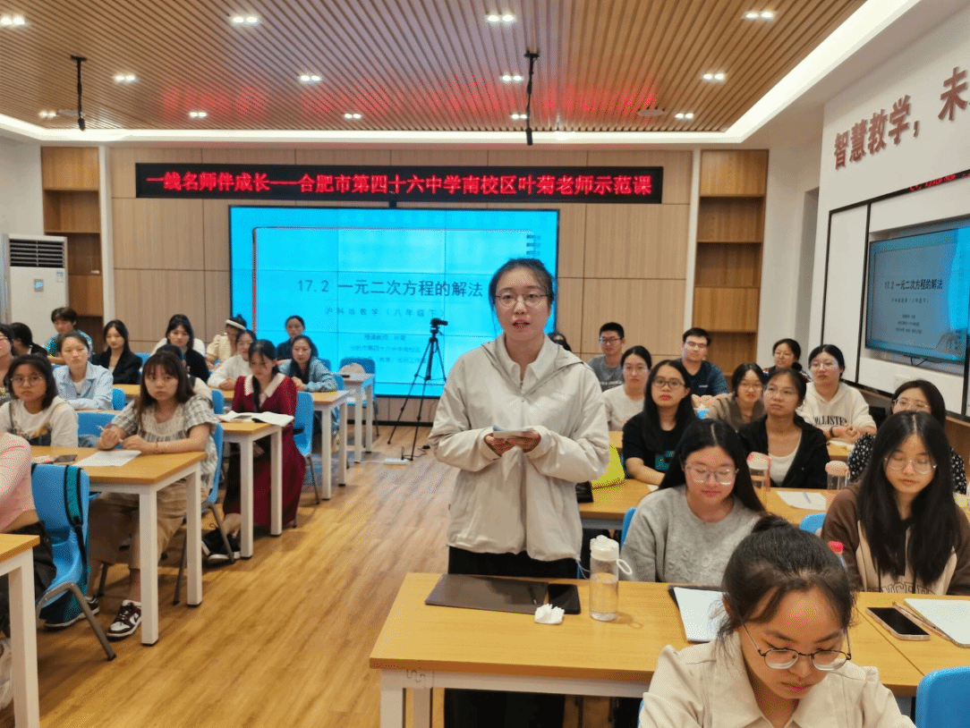 本网讯 9月20日下午,太阳成集团tyc234cc在锦绣校区逸夫楼B401智慧教室举办了“一线名师伴成长”活动,邀请了合肥市第四十六中学南校区的中学数学高级教师、安徽省五一劳动奖章获得者叶菊老师为师范生上了一节示范课,并为师范生指导教学技能。太阳成集团tyc234cc副院长杨刘、副院长黄浩,课程与教学论方向教师及来自数学与应用数学专业的部分师范生、学科教学(数学)方向教育硕士研究生共50余人参加本次活动,活动由黄浩主持。